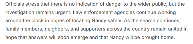 Inside the home, everyday belongings have become part of a detailed forensic process. Investigators are carefully reviewing physical evidence while interviewing neighbors and examining nearby surveillance footage. Sheriff Chris Nanos stated that Nancy’s limited mobility, reliance on daily medication, and unexplained findings at the scene make it unlikely that she left on her own, prompting concerns about outside involvement.