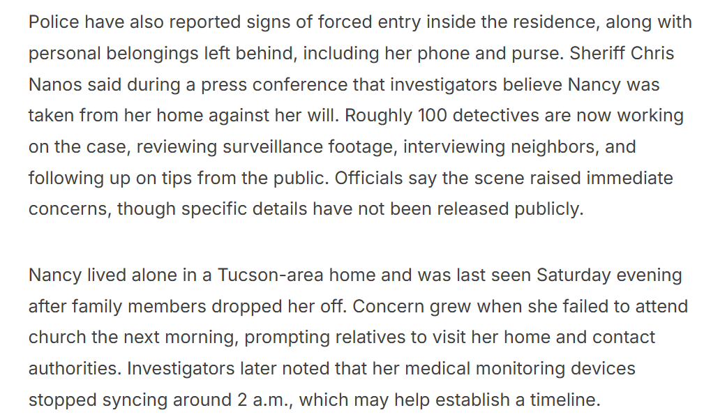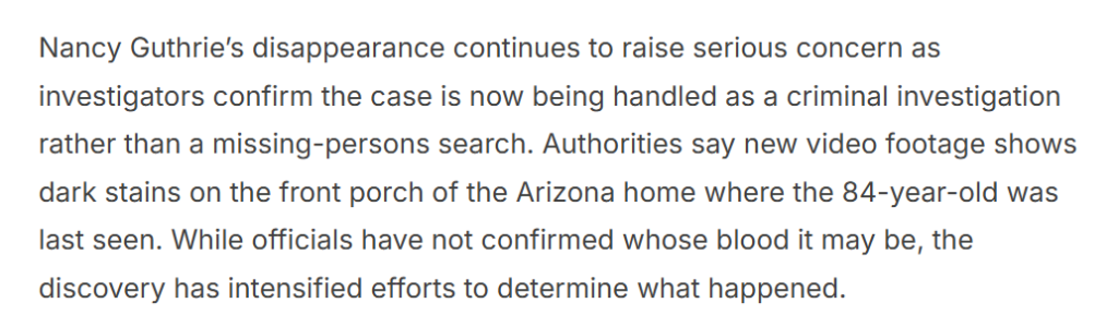 Her daughter, “Today” show anchor Savannah Guthrie, has stepped away from work to remain with family and has thanked the public for prayers and messages of support. Officials urge anyone with information, no matter how small it may seem, to contact local law enforcement immediately. As the investigation continues, authorities say their primary focus remains locating Nancy safely and bringing clarity and closure to her loved ones.