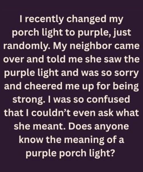 Although domestic violence awareness is the most common meaning, purple lights can also represent other causes, such as epilepsy awareness, Alzheimer’s awareness, or honoring Purple Heart veterans. Ultimately, the purple porch light serves as a reminder that even small gestures can help spark conversations and show compassion within a community.