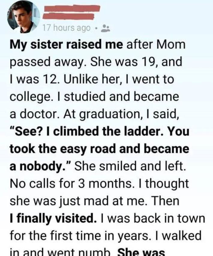 For a long time, it looked like we were. I thrived. I studied obsessively, chasing every rung of the ladder people call success: university, graduate school, and a career everyone praised. At my graduation, wrapped in a stiff gown and applause, I searched the crowd. She was sitting in the back row, clapping softly, her eyes shining as if this moment belonged to her more than to me. When I hugged her, pride overflowed—too much pride. “See?” I laughed. “I made it. I climbed up. You chose the easy path and ended up a nobody.”