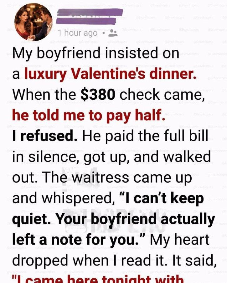 “This just feels strange to me,” she said carefully, choosing her words. “You planned this whole evening for Valentine’s Day. Why would I need to pay for half of the special date you invited me to?”