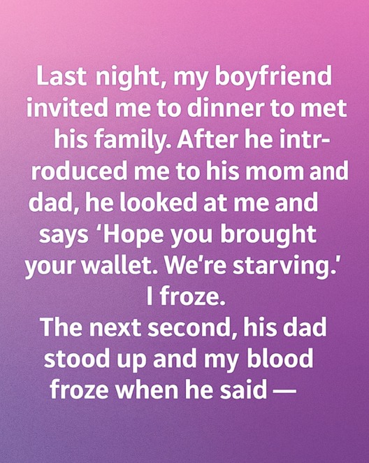 When my boyfriend invited me to dinner with his family, I spent the entire afternoon rehearsing polite greetings, practicing smiles, and agonizing over what outfit would make me look both mature and approachable. The moment we stepped inside, I was met with warm lights, the smell of roasted vegetables, and the sound of laughter coming from the dining room. His parents greeted me with enthusiastic smiles, but before I could relax, my boyfriend jokingly said, “Hope you brought your wallet.