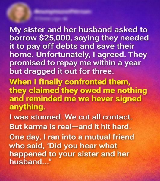 Over time, life shifted for them in unexpected ways. Financial struggles returned, stronger than before, and they found themselves in need again. This experience taught me a difficult but important lesson: trust and family don’t always guarantee fairness. Helping others should never come at the cost of your own stability. In the end, the greatest loss wasn’t the money—it was the trust that never fully returned.