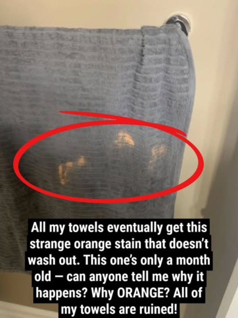 The most common reason for strange orange or light-colored marks on towels is a chemical called benzoyl peroxide. It’s a popular acne-fighting ingredient found in many products such as PanOxyl, Clearasil, Neutrogena, and some prescription creams. While it works well on skin, it is also a strong oxidizing agent—meaning it can act a lot like bleach when it touches fabric.