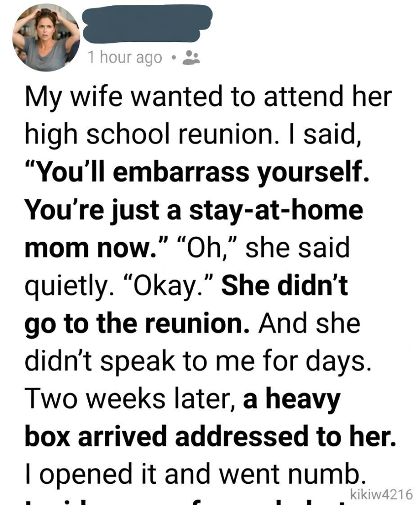 One night, after the kids had finally fallen asleep, we found ourselves sitting together in the living room. The house was quiet in that rare, peaceful way that only happens after a long day. She had her feet tucked under her, a blanket draped loosely over her legs. I hesitated for a moment before speaking, not because I didn’t know what to say, but because I wanted to say it right. “You should go next time,” I said. She looked at me, confused at first. “The reunion,” I added. “Or anything else you want. You deserve to be in rooms that remind you who you are outside of this house too.” She didn’t respond immediately. Instead, she studied me again, the same way she had before—carefully, thoughtfully. “And what if I’m still just a mom?” she asked quietly. The word just hung there again, but this time it felt different. I shook my head. “There’s no ‘just’ in that,” I said. “Not anymore. Not to me.” The silence that followed wasn’t heavy like before. It was softer. Open. She leaned back into the couch, exhaling slowly, as if releasing something she had been holding onto for a long time. And in that moment, I understood something I hadn’t before—she hadn’t needed applause from the world. She had needed respect from me.