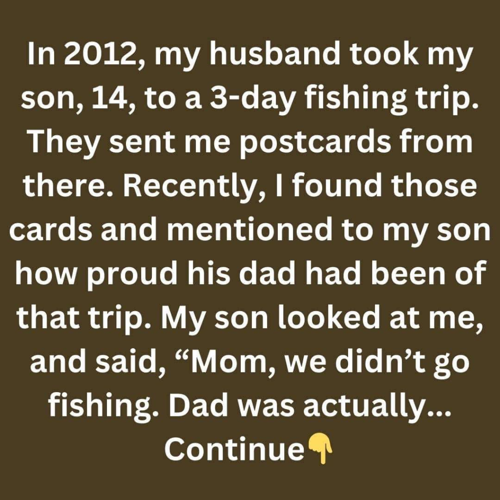 I remember exactly where I was standing when I found the postcards again—on a small wooden stool in the hallway closet, the kind we only opened when seasons changed or something was lost long enough to be considered gone. The box was tucked behind old scarves and a broken umbrella, sealed with a strip of yellowing tape that had lost its stick years ago. Inside were pieces of our past: birthday cards, photographs, school drawings, and then those postcards. Three of them. Each stamped, each written in my husband’s familiar, slightly slanted handwriting. I smiled before I even read them, already warmed by the memory of that trip in 2012, when he took our son away for three days—just the two of them. A fishing trip, he’d said. “Man time.” I remembered how proud I’d felt watching them leave, my son trying to act older than fourteen, my husband laughing as he loaded the car. Those postcards had arrived one by one, each describing lakes, early mornings, the thrill of catching fish. I had kept them like small treasures. And now, holding them again, I walked into the living room where my son—no longer a boy—was scrolling absently through his phone. “Do you remember these?” I asked, smiling. “Your dad was so proud of that trip.” I expected nostalgia. Maybe a laugh. But instead, he looked up at me in a way that immediately made something inside me tighten. Not confusion. Not fondness. Something heavier. “Mom,” he said slowly, “we didn’t go fishing.”