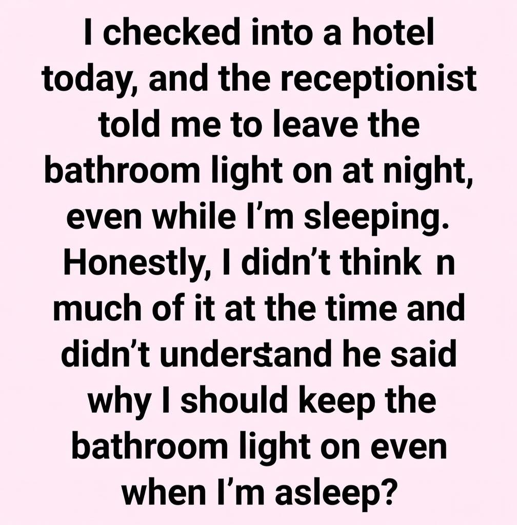 I checked into the hotel just as the evening sky began to dim into a soft gray, the kind of quiet transition that usually brings comfort after a long day of travel. The lobby had a strange stillness to it, not unsettling at first, just unusually calm, like time itself had slowed down within those walls. The receptionist barely looked up when I approached, his voice low and deliberate as he handed me the key. It was only when I turned to leave that he added, almost as an afterthought, that I should keep the bathroom light on at all times, even while sleeping. I paused, half expecting him to explain, but he simply returned to his paperwork as though nothing unusual had been said. I shrugged it off, assuming it was some outdated hotel quirk or perhaps a way to help guests navigate the room at night. By the time I reached my floor, the thought had already begun to fade, replaced by the usual fatigue of travel. The room itself seemed normal enough—clean, modest, with a faint scent of something old but not unpleasant. I tossed my bag onto the chair, checked my phone, and went about settling in. The bathroom light remained off as I brushed my teeth, and I almost laughed at the odd instruction, deciding it was unnecessary. When I finally climbed into bed, the darkness wrapped around the room in a way that felt heavier than it should have, but I told myself it was just unfamiliarity. Still, as I lay there, something about the silence pressed against my thoughts, as if the room itself was waiting for something I didn’t yet understand.