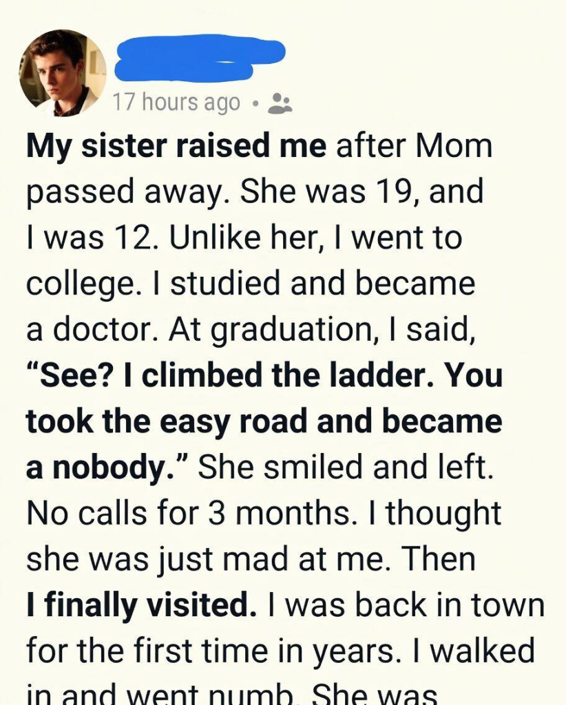 There are moments in life that seem small when they happen, sentences spoken in passing, thoughts expressed without hesitation, judgments made from a place of certainty that feels unshakable at the time, yet those same moments can quietly shape the course of everything that follows. I did not understand that when I stood there in my graduation gown, surrounded by applause, pride, and the overwhelming belief that I had earned everything on my own. The world felt neatly divided in my mind—those who worked hard and rose, and those who settled for less. In that narrow view, I placed myself at the top and my sister somewhere far below, blind to the truth that had been holding me up all along. When the words left my mouth, sharp and dismissive, I felt powerful for a fleeting second, as if I had finally defined my success. But the silence that followed was unlike anything I had ever experienced. It wasn’t loud or confrontational; it was quiet, heavy, and filled with something I refused to name at the time. She simply looked at me with that same tired softness she had carried for years, smiled in a way that held no anger, and walked away, leaving me standing in a moment I would replay in my mind countless times later.