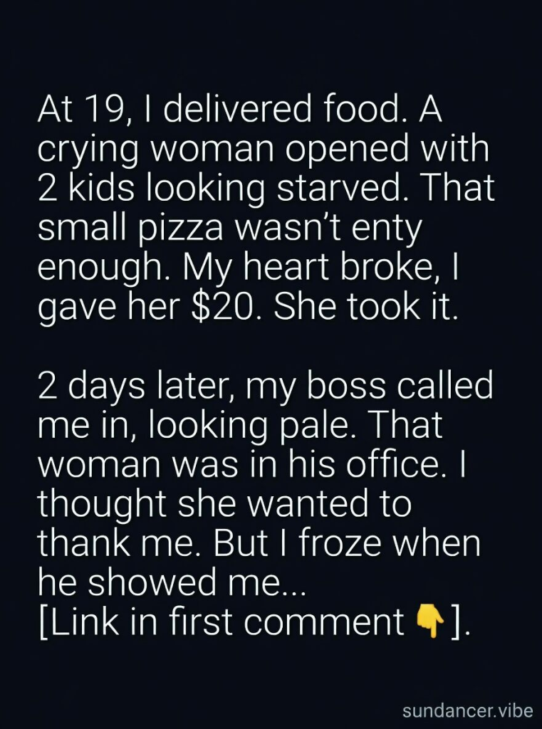 I was called into my boss’s office in the middle of a shift. That alone was enough to make my stomach drop. He wasn’t the type to call people in unless something was wrong. As I walked in, I noticed someone sitting across from him—and my heart sank. It was her. The same woman from that night. My mind raced instantly. Had I done something wrong? Had I crossed a line by giving her money? Maybe she thought it was inappropriate. Maybe she had complained. Every possible mistake ran through my head in seconds. The room felt smaller, the air heavier. My boss looked serious, and that only made it worse. I braced myself for whatever was coming next.