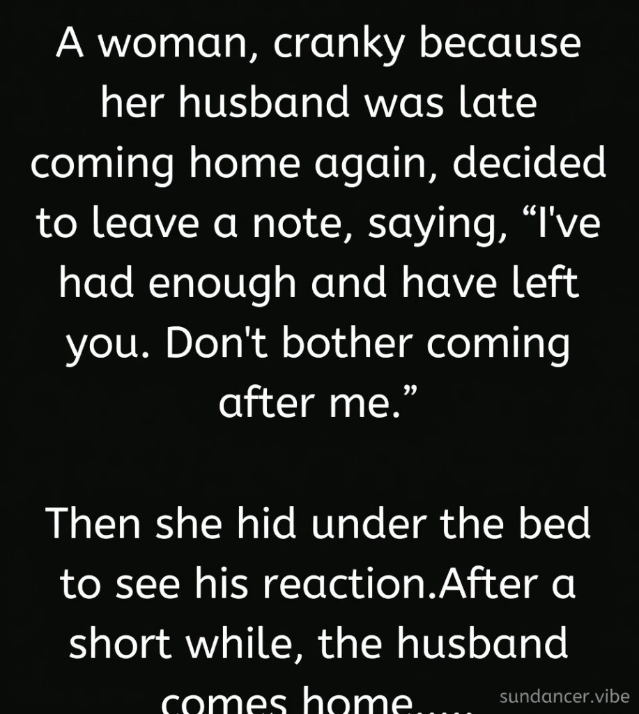 That evening, her irritation grows stronger with every passing minute. The silence in the house feels louder than usual, filled with questions she doesn’t have answers to. Where is he? Why is he late again? Is there something he isn’t telling her? These thoughts swirl together, turning frustration into suspicion. Instead of confronting him directly, she decides to do something bold—something dramatic. She writes a note and leaves it in a place where he will clearly see it. The message is simple, sharp, and final: she claims she’s had enough and that she’s leaving him, making it clear he shouldn’t bother trying to find her.