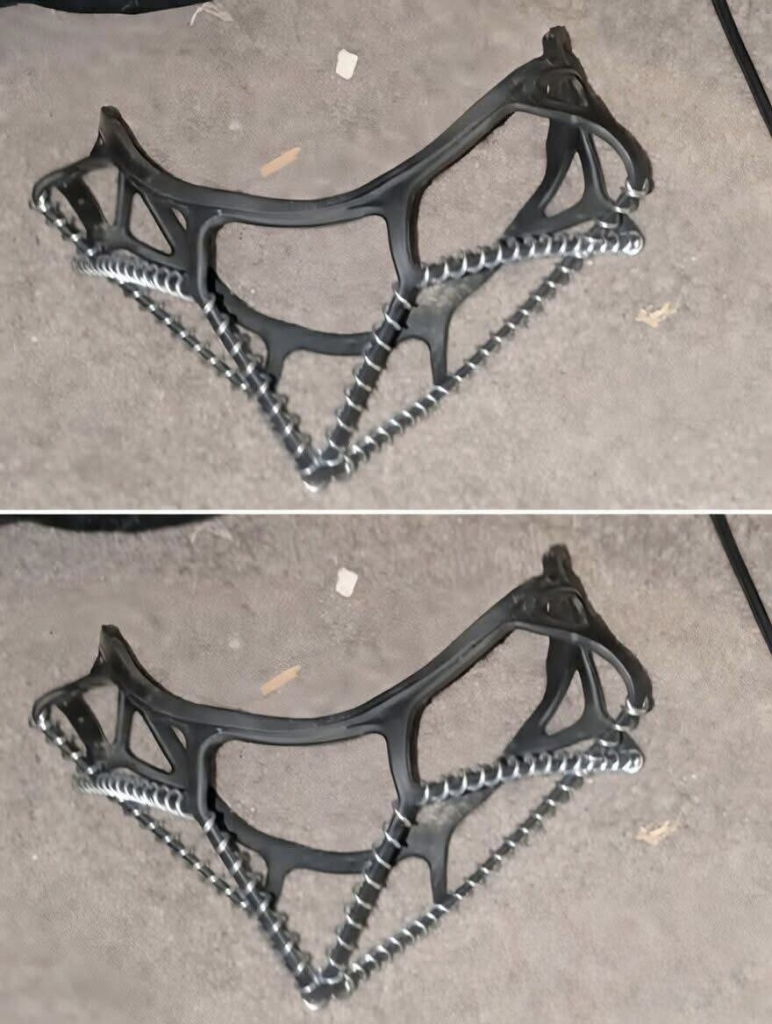 At first glance, the object resembled a lower-face mask, but not the kind you’d find in a store or workshop. Its skeletal frame was carefully designed, made up of angular cutouts that gave it both strength and lightness. Running along its edges were rows of small metallic coils, each one reflecting the dim overhead light with a subtle shimmer. They weren’t decorative in a careless way—they felt purposeful, almost engineered for movement or response. When I picked it up, I expected it to feel heavy or awkward, but it didn’t. It balanced perfectly in my hands, as though it had been designed with precision and intent. When I gently pressed against the sides, the coils responded with a faint, almost whisper-like tension. It was enough to make me pause. This wasn’t just an object—it was something built with thought, something that had a function, even if I couldn’t immediately understand it. I remember glancing over at my dad, wondering if he had noticed it, but something stopped me from calling out right away. There was a strange instinct to keep the moment quiet, to observe before asking questions, as if speaking too soon might break whatever mystery had settled into that space.