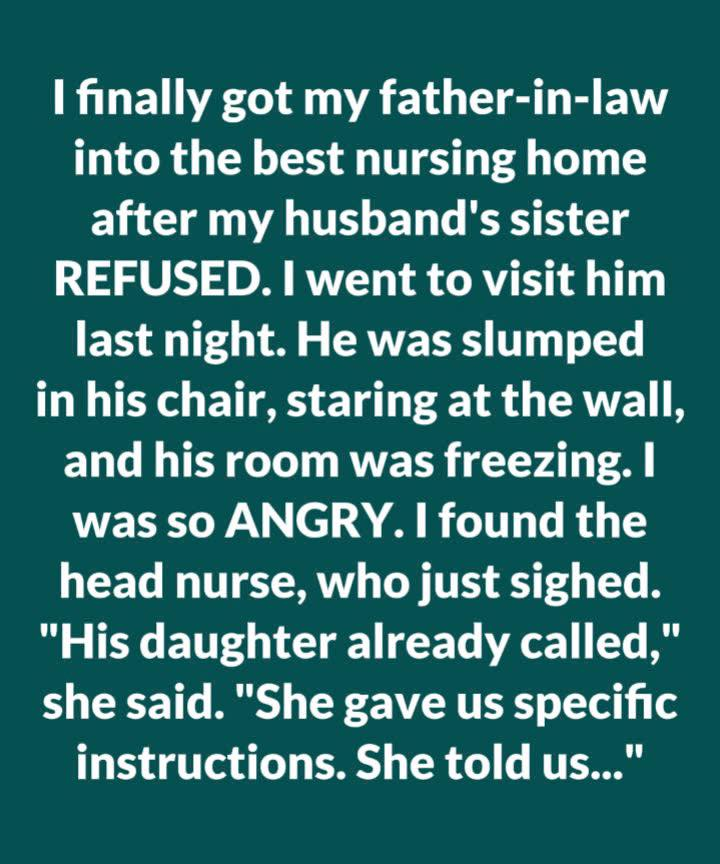 I was the one who finally got my father-in-law into a top nursing home—after my late husband’s sister refused to help. One evening, I visited him after work and noticed something immediately: the room was freezing. He sat slouched in his chair, eyes distant. Anger flared. I found the head nurse, who told me Diane, his daughter and legal proxy, had instructed them not to turn on the heat unless it dropped below fifty. “He prefers it cold,” she said. I knew he suffered from severe arthritis and always complained if it was under seventy.