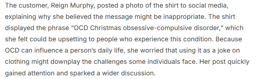 At the same time, others who experience OCD offered a different point of view. Some said they were not personally bothered by the shirt and saw it as a light-hearted holiday pun rather than something meant to cause discomfort. With mixed opinions coming in, Target responded through spokesperson Jessica Carlson, who apologized to those who felt uneasy but stated that the product would remain on shelves.
