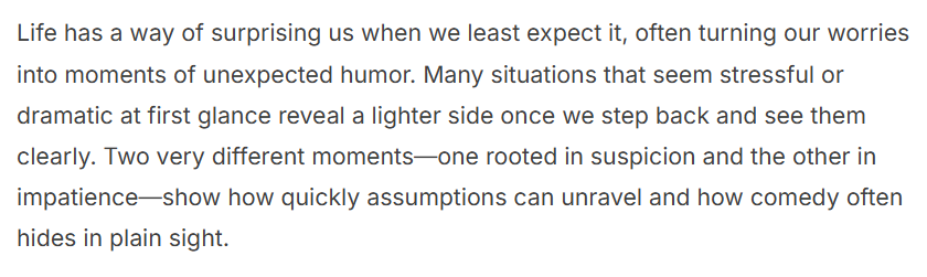 Without anger or confrontation, she responds in a way that flips the situation entirely, leaving the impatient driver stunned and the moment unforgettable. Both stories highlight the same lesson: assumptions often miss the truth. Life rarely follows the dramatic script we imagine, and humor tends to appear when expectations collapse. Whether it’s misplaced suspicion or unnecessary impatience, these moments remind us that a sense of perspective—and a willingness to laugh—can turn tension into insight. In the end, adaptability and calm often prove far more powerful than control.