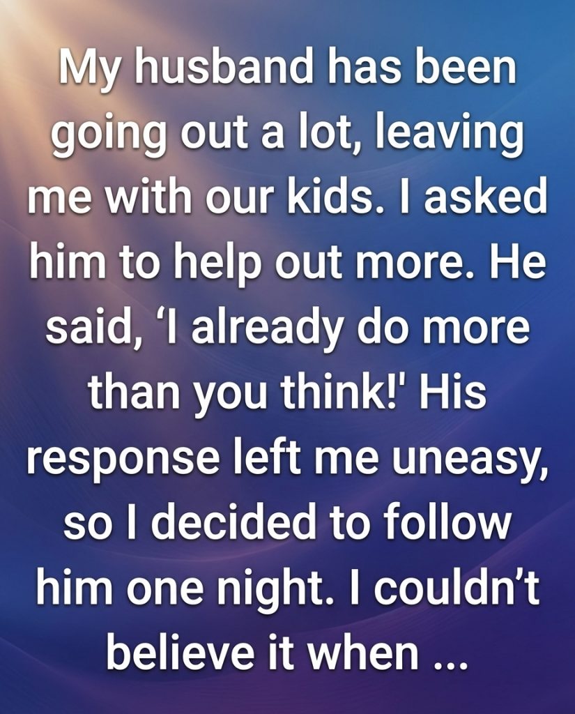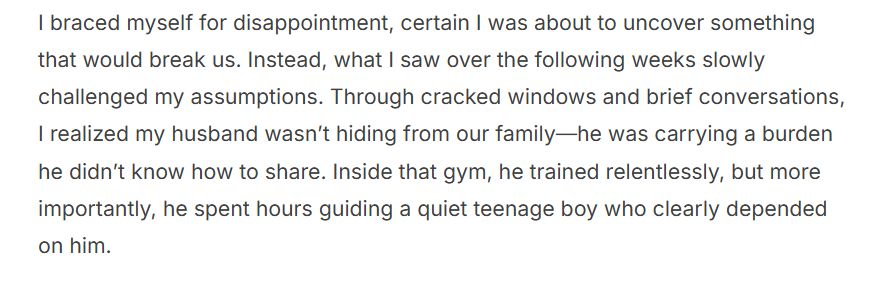 When my husband began leaving the house almost every evening, my mind went to places I never wanted to visit. He offered vague explanations, avoided details, and grew defensive whenever I asked questions. Left alone with the kids night after night, I felt distance growing between us. Eventually, worry outweighed trust, and one evening I decided to follow him. I watched as he parked outside a worn-down gym on the edge of town and slipped inside.