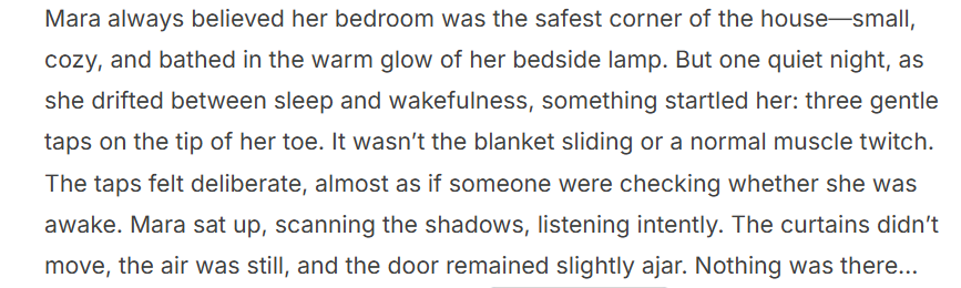 Instead of letting fear grow, the family transformed the room. Windows opened to welcome fresh air, light and music filled the space, and Mara rearranged her furniture. She added comforting touches—a dreamcatcher, a small plant, and a sense of control over her environment. That night, the taps never returned. Mara realized the change wasn’t in the room—it was in her. Fear faded, replaced by security, love, and the quiet understanding that she was never truly alone.