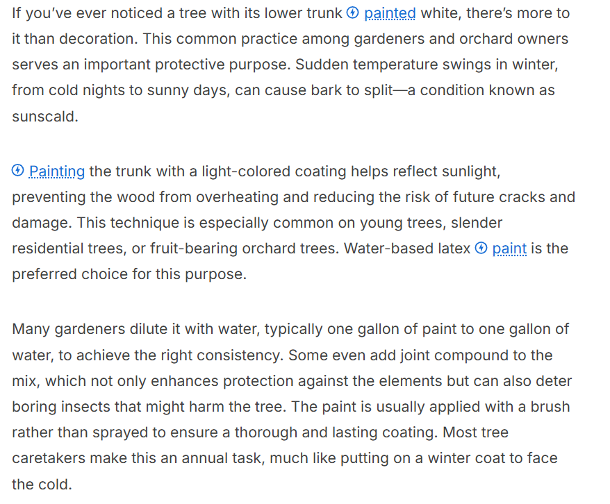 While tree markings can convey other messages—like orange dots indicating trees slated for removal or purple markings signaling boundaries—the white trunk is purely protective. It’s a practical measure, not a decorative statement, reflecting the thoughtful care and attention of dedicated tree enthusiasts. In essence, a white-painted trunk is a sign of careful stewardship. With each tree cloaked in its protective coat, gardeners safeguard its health, resilience, and longevity, ensuring these leafy giants thrive for years to come.